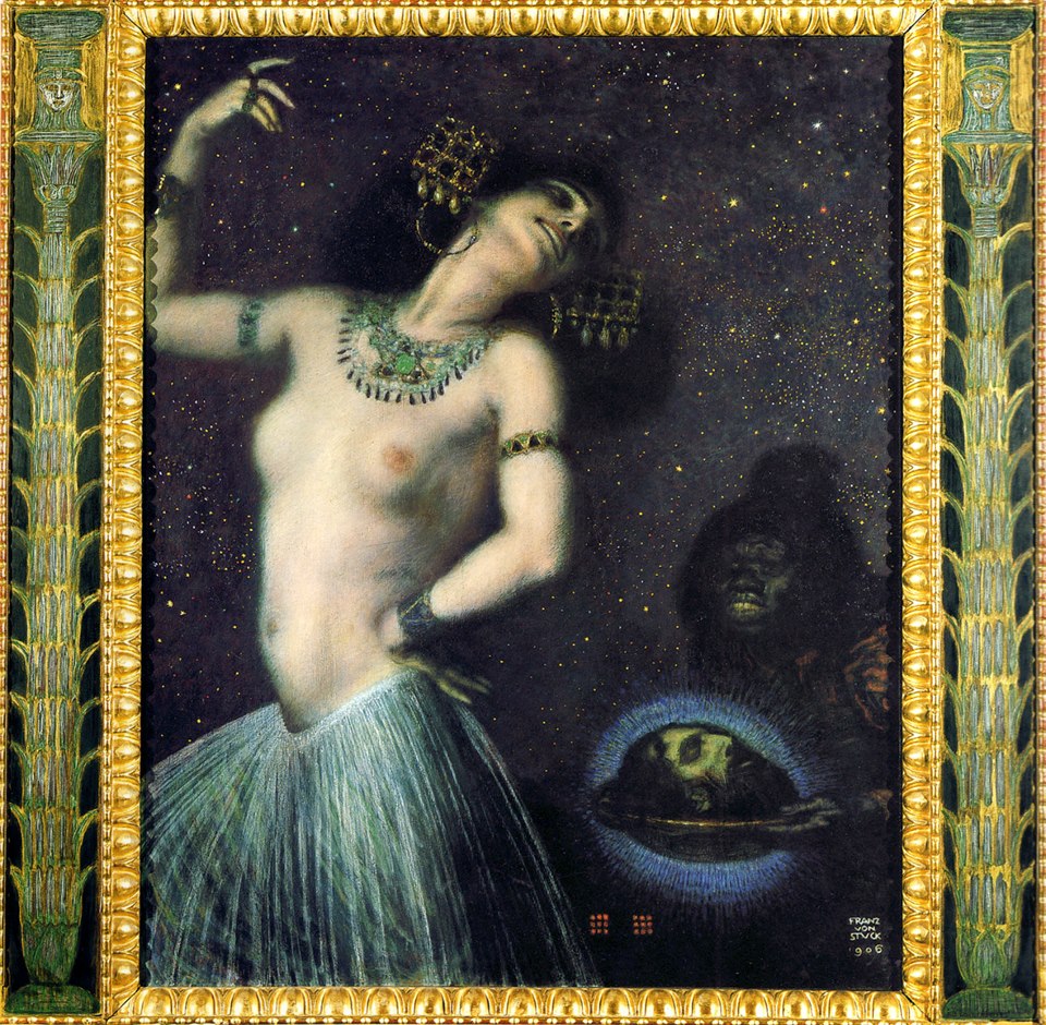 Stuck’s other famous painting is Salome, painted in 1906, shows a fierce femme fatale. Salome was the daughter of Herod II and wanted John the Baptist’s head, just like Judith desired Holofernes’ head. In the painting Salome’s face shows ecstasy, joy, sensuality and pleasure after the beheading of John the Baptist. We understand this because she is dancing while a black servant brings her his head.